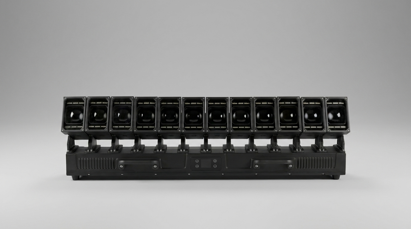 What separates this fixture from a conventional moving head is the per-module independence of both tilt (Y-axis) and zoom (Scaling). Each of the 12 modules has its own coarse tilt channel, fine tilt channel, zoom channel, and speed channel. This means a single fixture can simultaneously point modules in different directions, fan them across a wide arc, or create wave-like motion patterns — all without a media server.